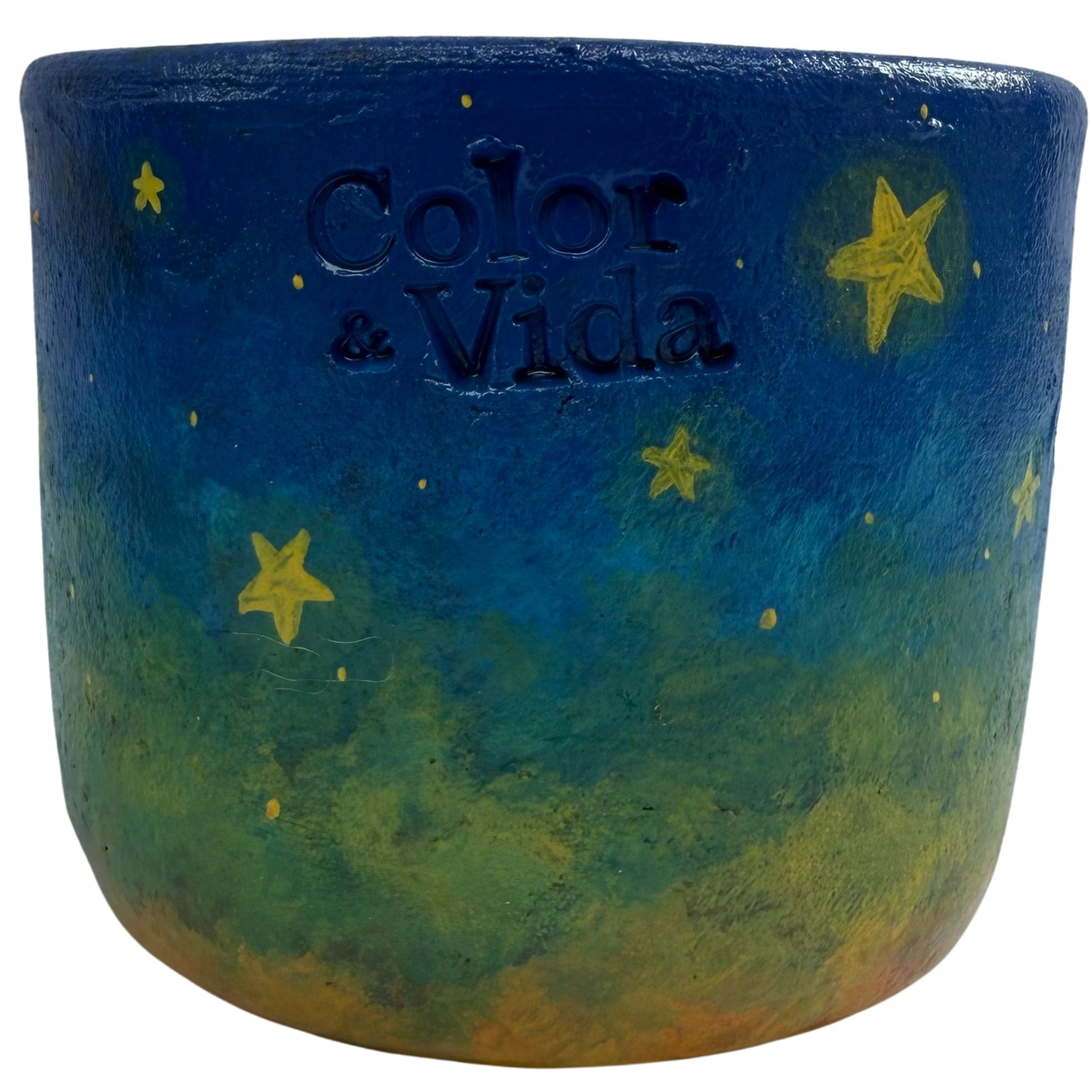 Macetero de greda originario de Pomaire, pintado a mano. Acondicionado para interiores y exteriores.